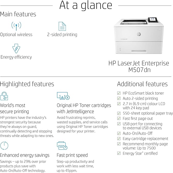 HP LaserJet Enterprise M507dn, mono color compact printer, energy-efficient, Print speed up to 45 page per minute – for enterprises and medium businesses – 1PV87A, White